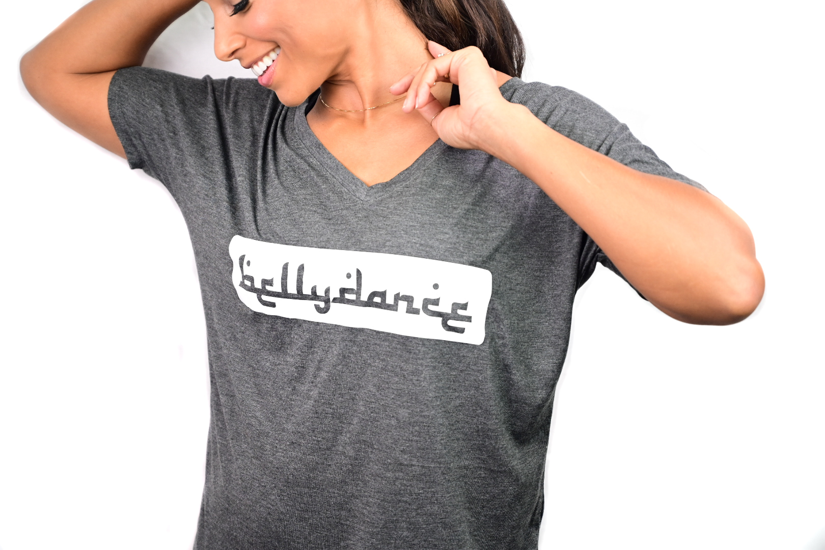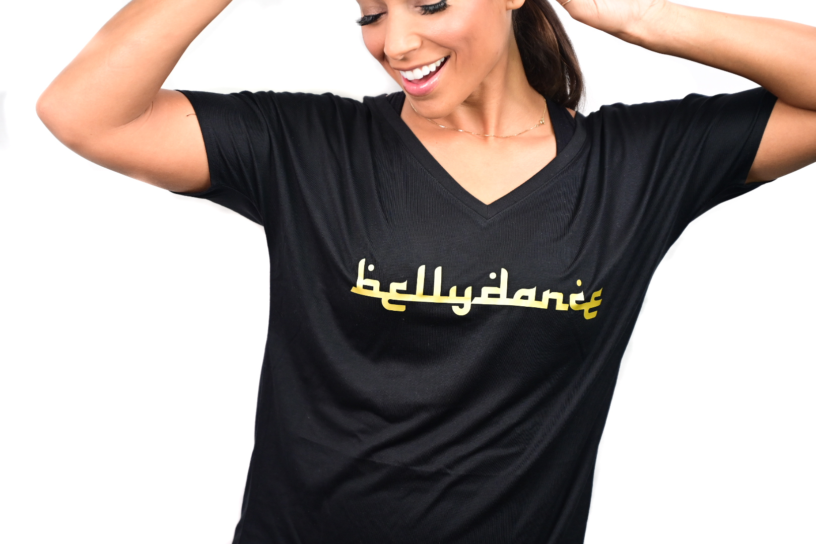 Perfect top for your Fitness Bellydance classes! Can be worn loose, tied in a knot for a more fitted look, or cut as a halter top (cutting available for an additional fee) Designed to perfectly drape over a woman’s body, this easy-to-wear V-neck tee features a luxuriously soft poly viscose fabrication, slouchy fit and short sleeves.